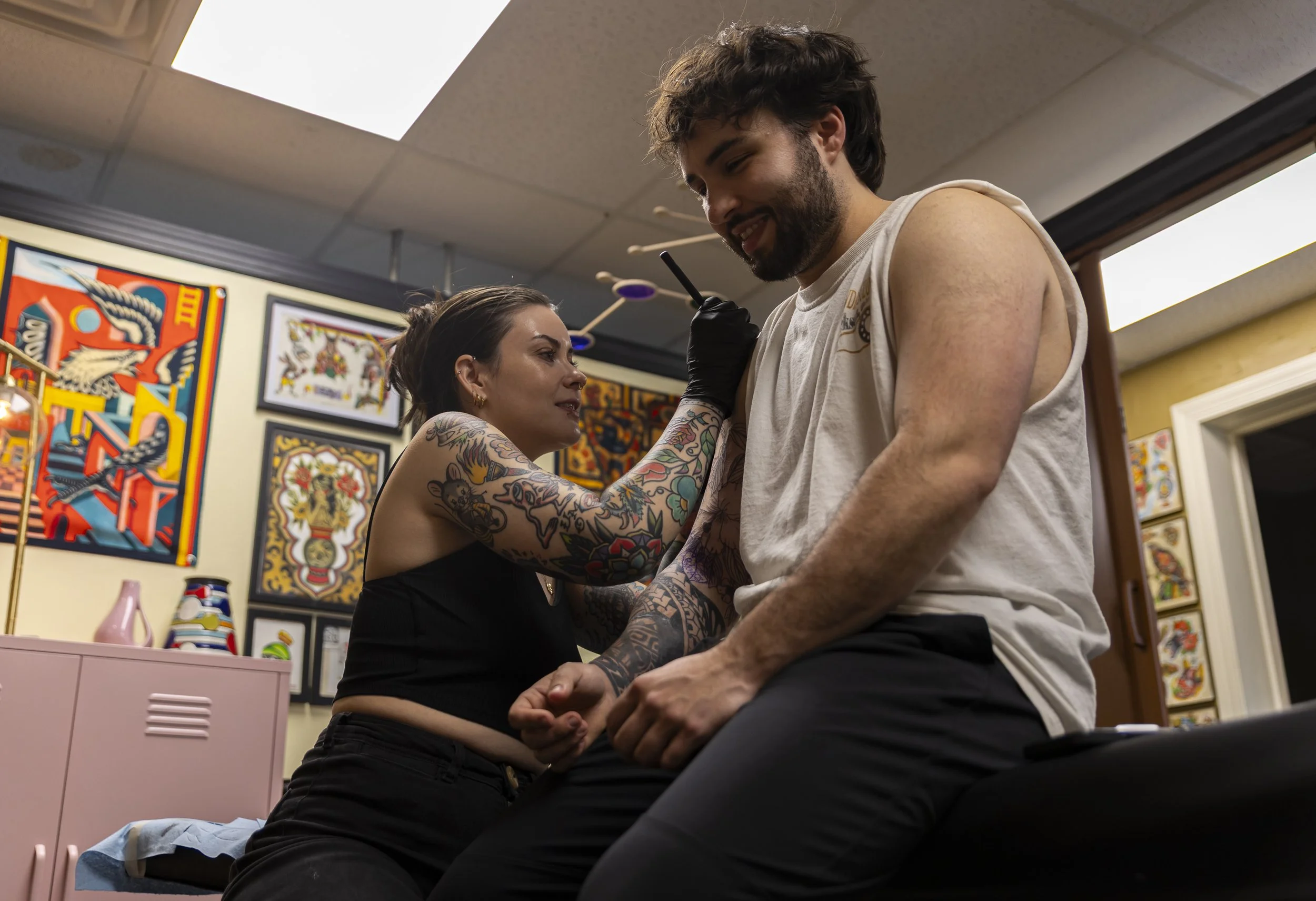 The process of being tattooed can be a long and painful one. Depending on the placement, it can run along bones, nerves, and some of the most sensitive spots on the human body. But Joee knows this, having dozens of tattoos of her own. She allows her clients to do what they need to do to deal with the pain, whether it be allowing them to clutch her thigh during the process or letting them take as many breaks as needed.